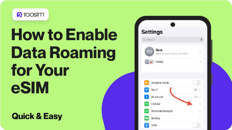 To use the internet abroad with an eSIM, simply turn on «Data Roaming» — your prepaid plan has a fixed cost, without extra roaming charges.